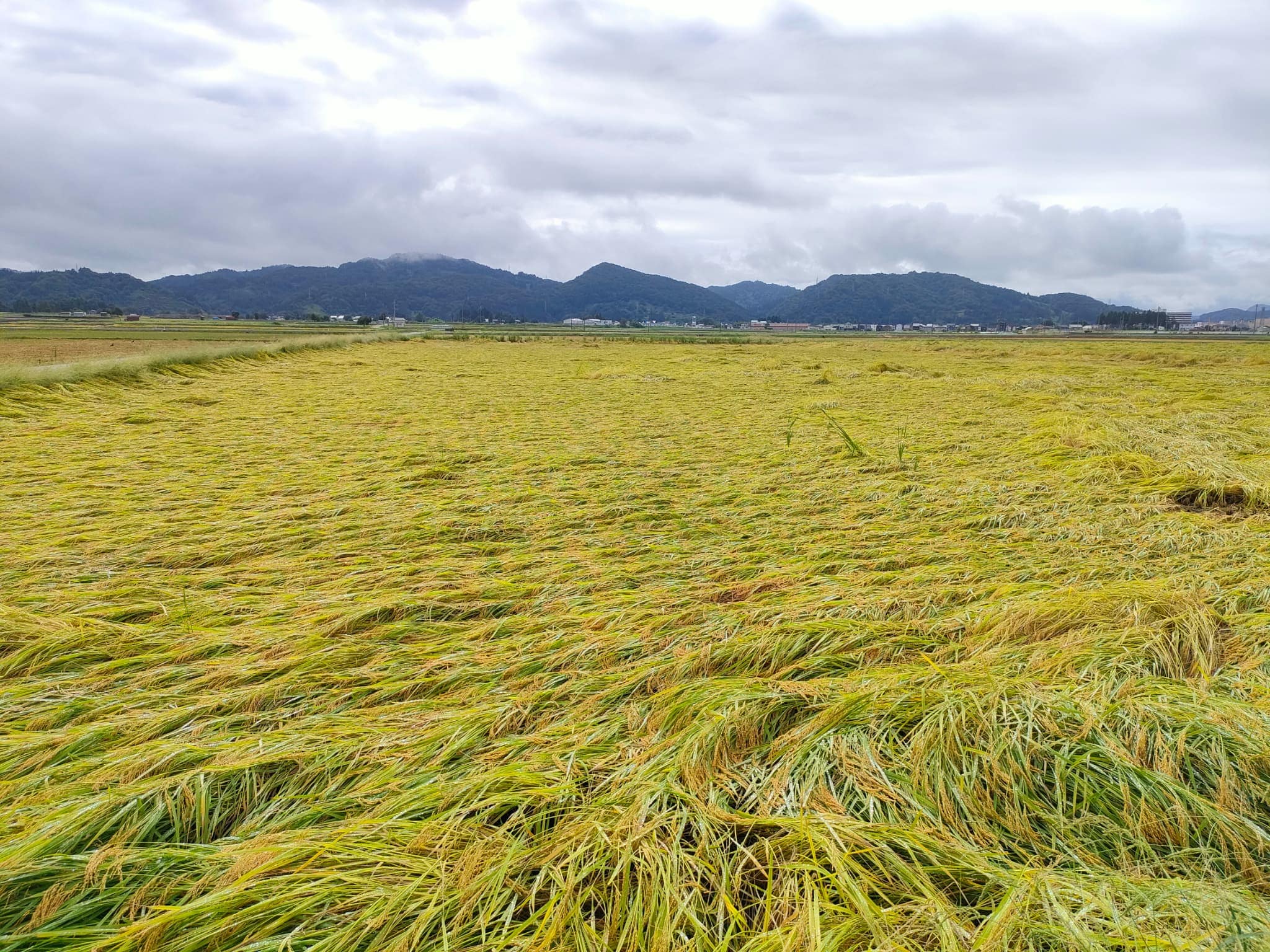 下の写真は我が家の田んぼです。全面的に倒伏して刈り取りにとても苦労しました。