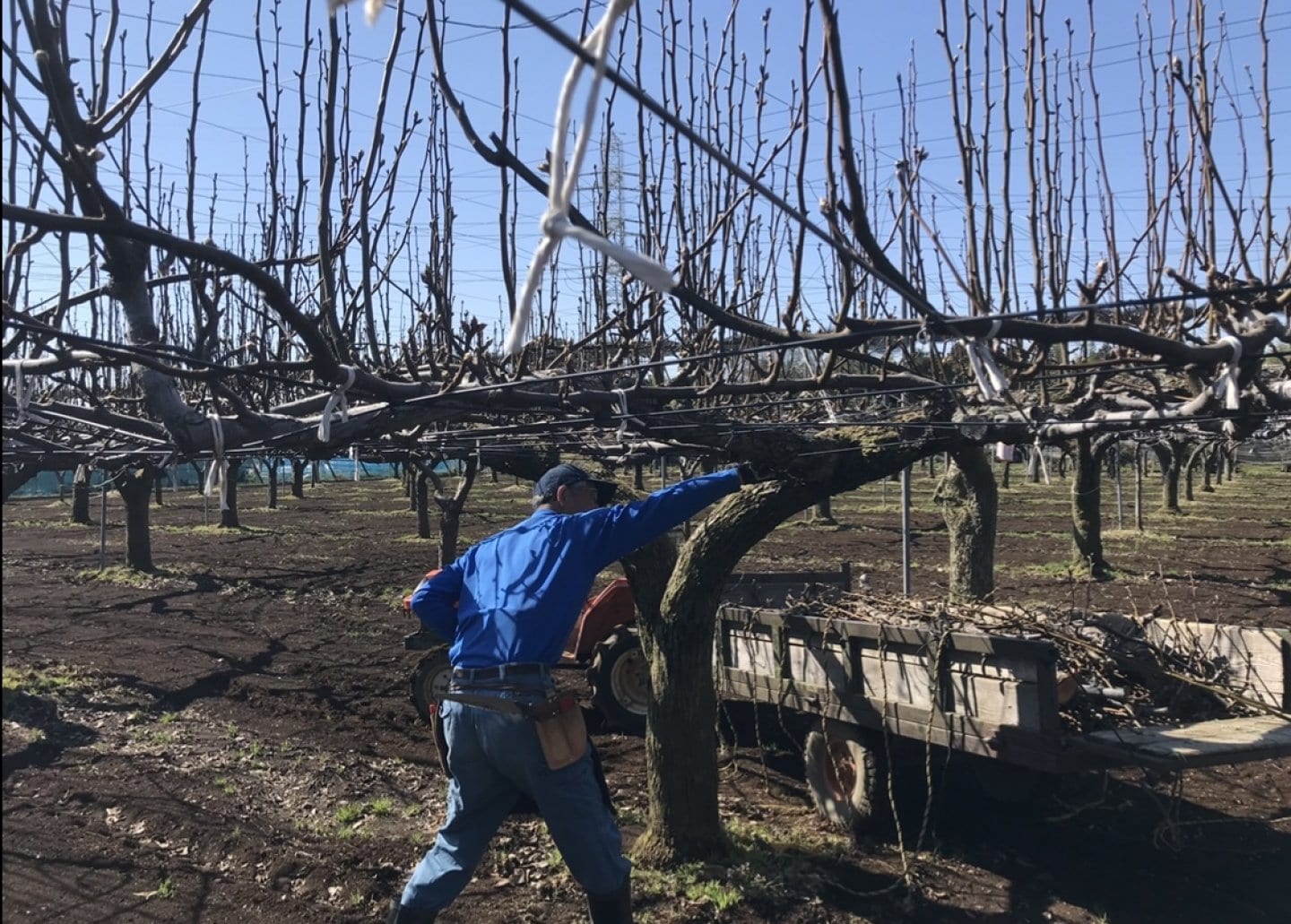 不要な枝をハサミやノコギリなどで切り、適正量・長さに調整し、枝を梨棚に縛ります。品種特性に合わせた樹をつくります。