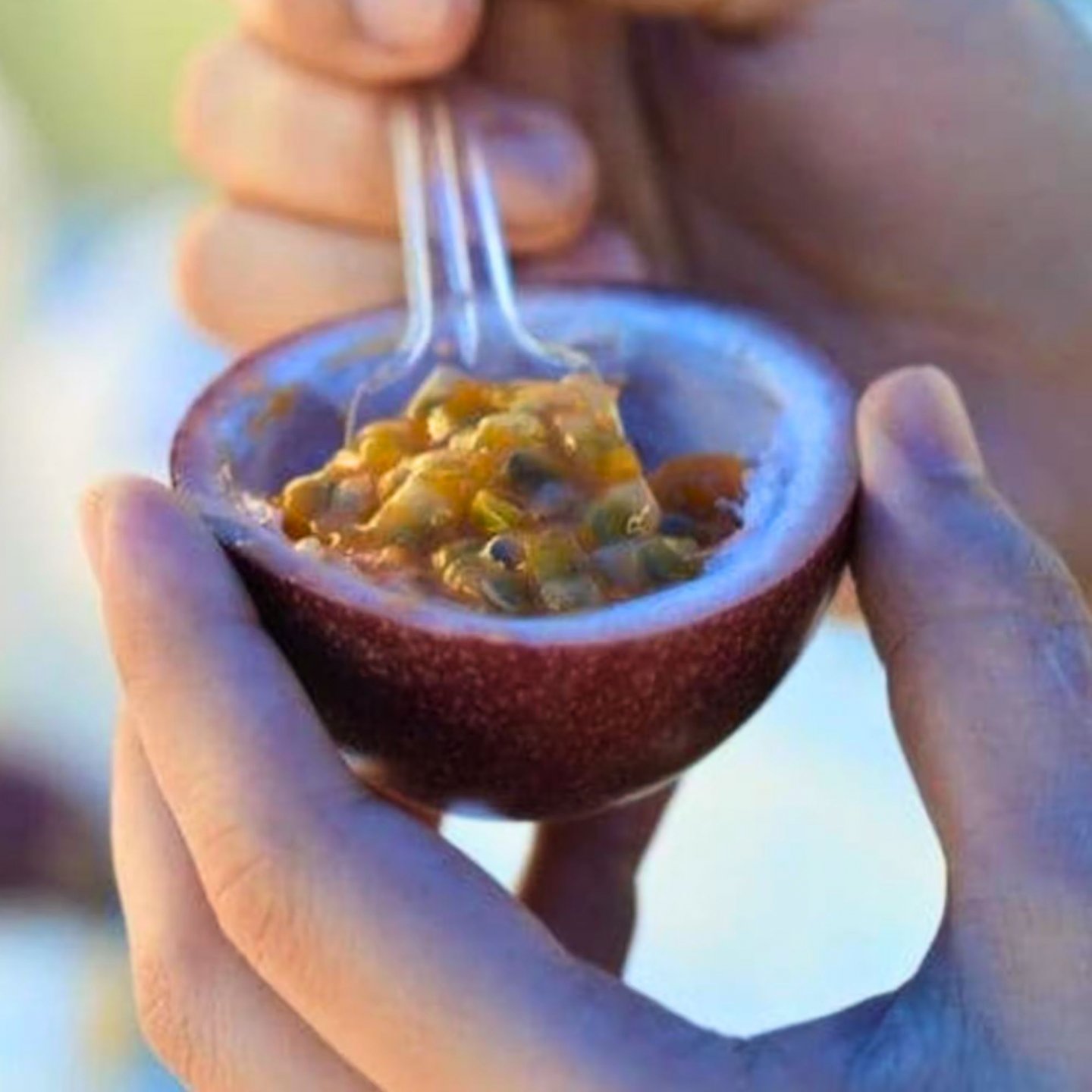 当パッションフルーツの通の食べ方は、黄色の実をつつむ薄皮まで食べること。無農薬パッションだから薄皮までおいしい!ほんのり甘みのあるなんとも言えないおいしさです♪