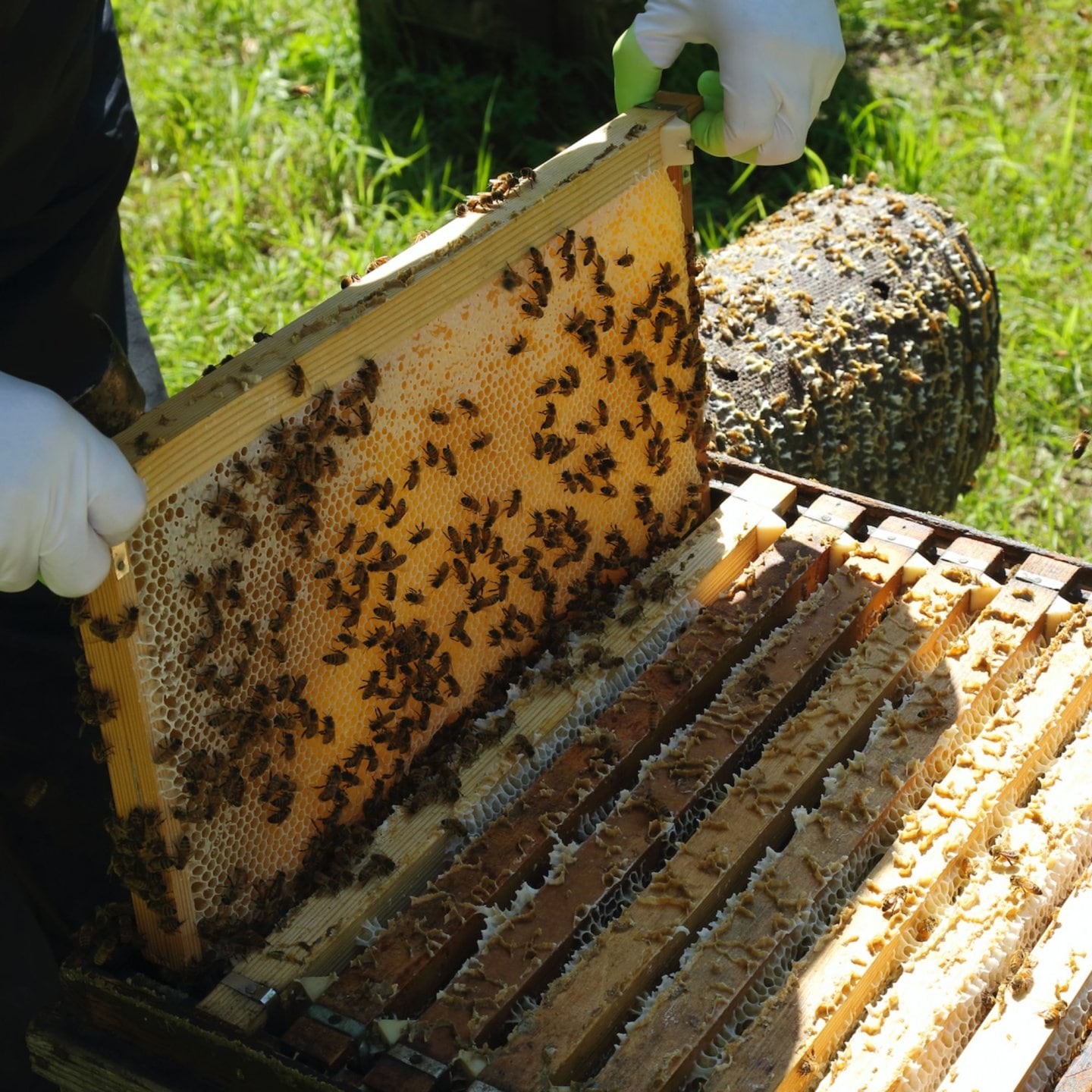 当養蜂場ではミツバチの健康状態に常に注意を払い、抗生物質不使用による養蜂を実現しています。