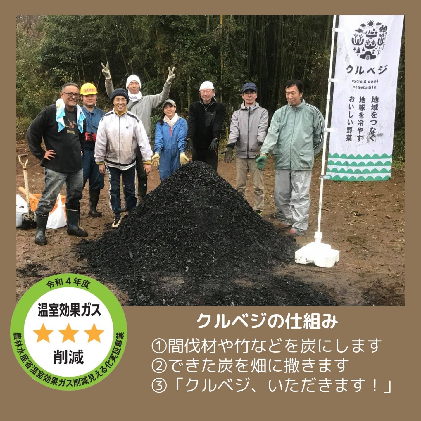 クルベジは、炭を埋めた畑で育てたおいしい野菜。炭づくりには里山の間伐材や竹を活用し、農薬・化学肥料は使わずに育てています。