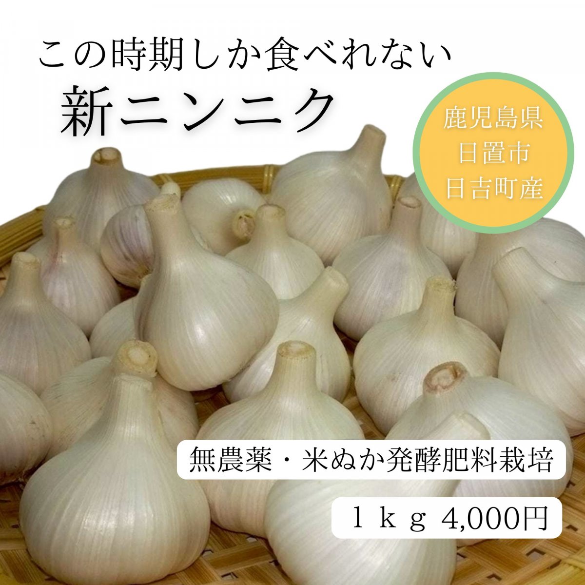 農薬不使用、米ぬか発酵肥料栽培の上原ファームの農園で栽培されている、こだわりの「期間限定 新物 生にんにく」です。
