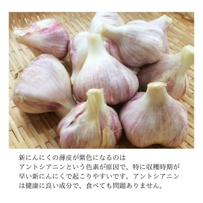 「土の付いたにんにくの皮をむけば非常に美しい白いにんにくと、新ならではのみずみずしさと最高の風味が味わえます。