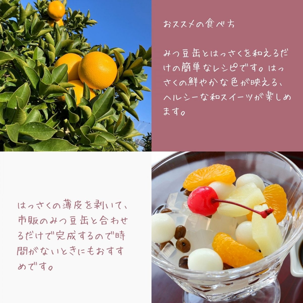 外の皮をむき、果皮をむいて食べるのが一般的でおすすめです。ヨーグルトに入れて食べたり、サラダに混ぜたり、またはスイーツとしてみつ豆に入れるなど…いろいろな食べ方をお楽しみください。ほかにも、ひと手間かけて果肉や外皮を使ってジャムやマーマレード、砂糖漬けピールなども美味しくいただけます。