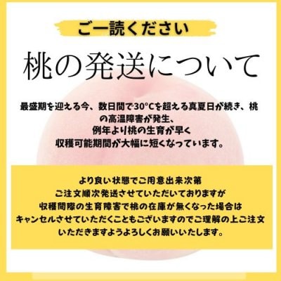 ⚠️上記の記載(ご一読ください)にもありますように、最盛期を迎える今、高温状態による桃の生育が早く収穫間際で桃の在庫が無くなった場合はキャンセルさせていただだくこともございますので、ご理解の上ご注文いただきますようよろしくお願いいたします。