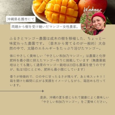 「やさしい和加乃マンゴー」を沖縄からお届けできることを嬉しく思います。毎日、農園に通って「おはよう」「ありがとう」「美味しくなぁれ」と話かけて愛情いっぱい育ったこだわり栽培の唯一無二のマンゴー。箱を開けた瞬間に沖縄の風を感じるマンゴーの香りが特徴的。食べると口の中に甘ったるさが残らず、あと味スッキリの健康にもやさしいこだわり栽培のマンゴーをご堪能ください。