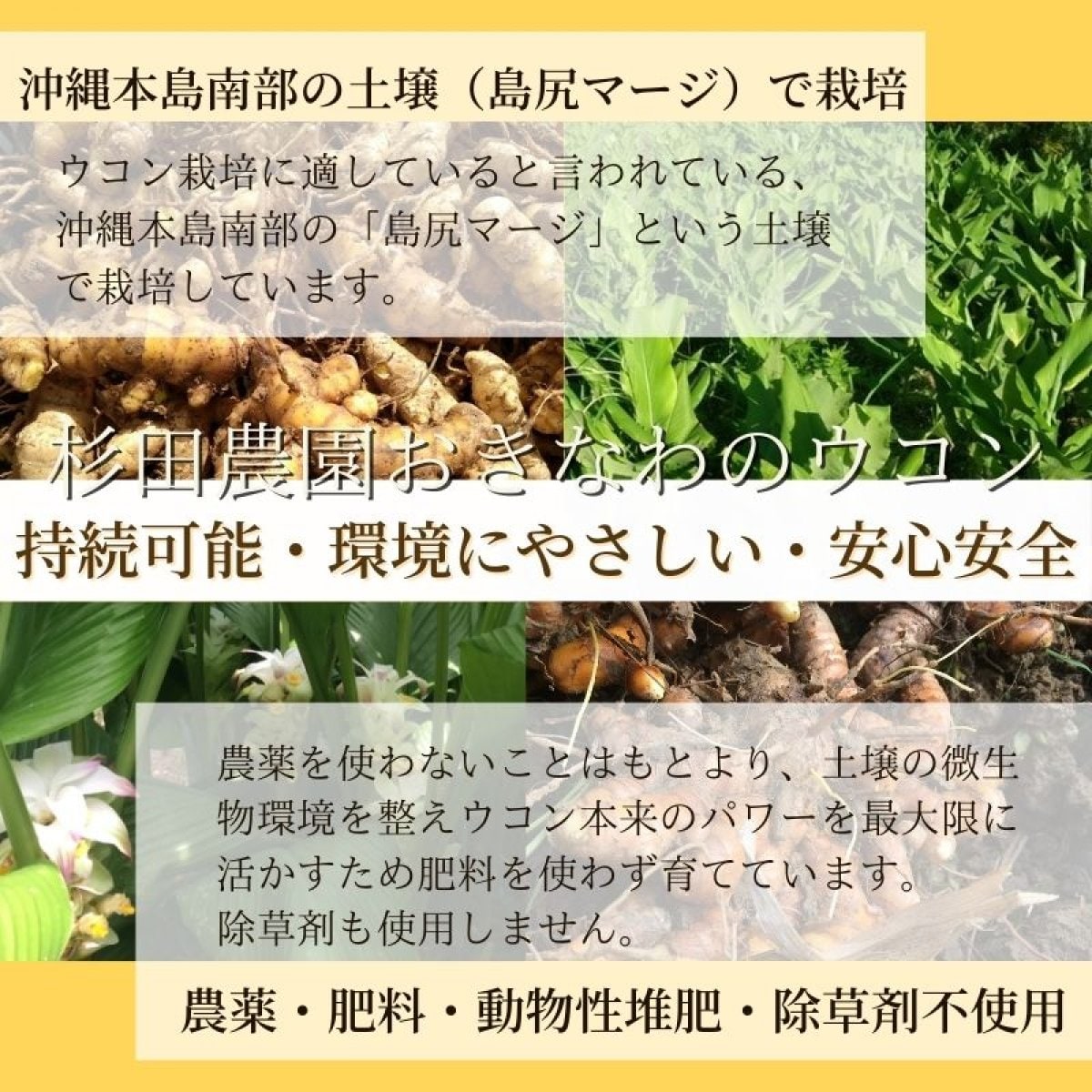・農薬・肥料・除草剤不使用で栽培した、自家栽培の沖縄県産春ウコンのみを使用しています。