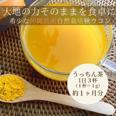 ・1日3g(小さじ半分=1g程度をコップ1杯分とし、1日3杯程度)を目安として、秋ウコン(うっちん)茶として水またはお湯に溶いて召し上がりください。