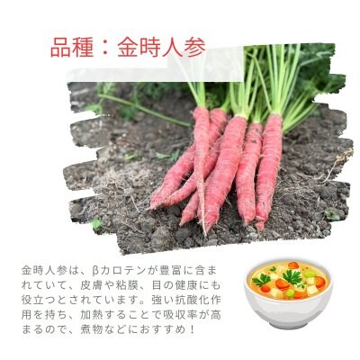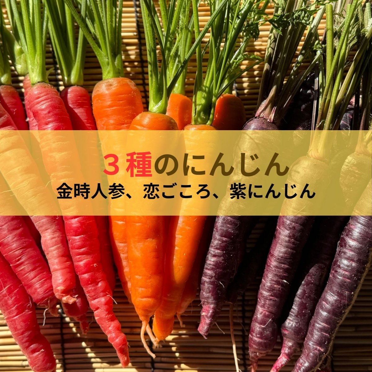 彩り豊かな3種類のにんじん(恋ごころ、金時人参、紫にんじん)で、サラダやジュースなど生でも甘くて美味しいですよ。