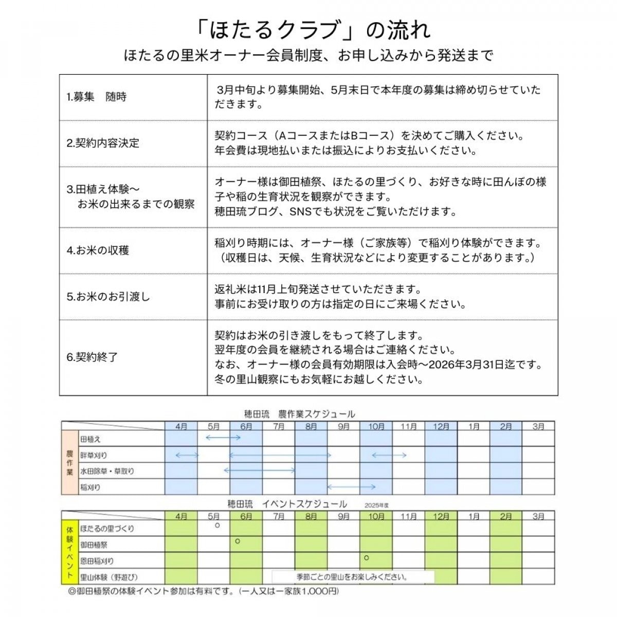〇田植え、収穫作業、ほたるの里づくりなどの体験イベントに参加できます。(一部有料)