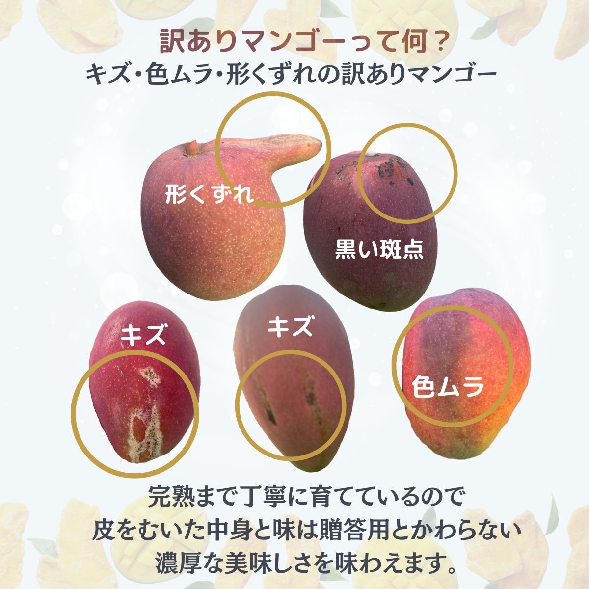 【訳あり用】とは、色ノリが普通で、形が不揃いで若干のキズがあるアップルマンゴーですが、芳醇な香り、濃厚な味わいは期待通りの完熟沖縄マンゴーをご堪能いただけます。色んな形などがありますが、甘みも香りも良く、ご家庭で美味しくいただける商品です。